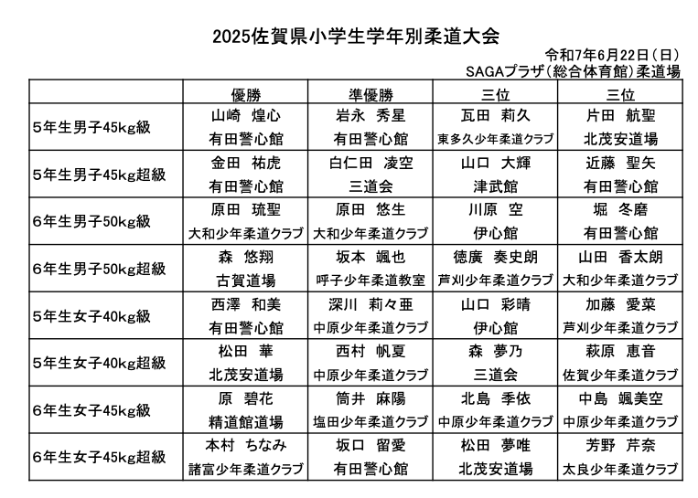 令和7年6月22日(日)に2025佐賀県小学生学年別柔道大会を開催しました。入賞者は以下のとおりです。